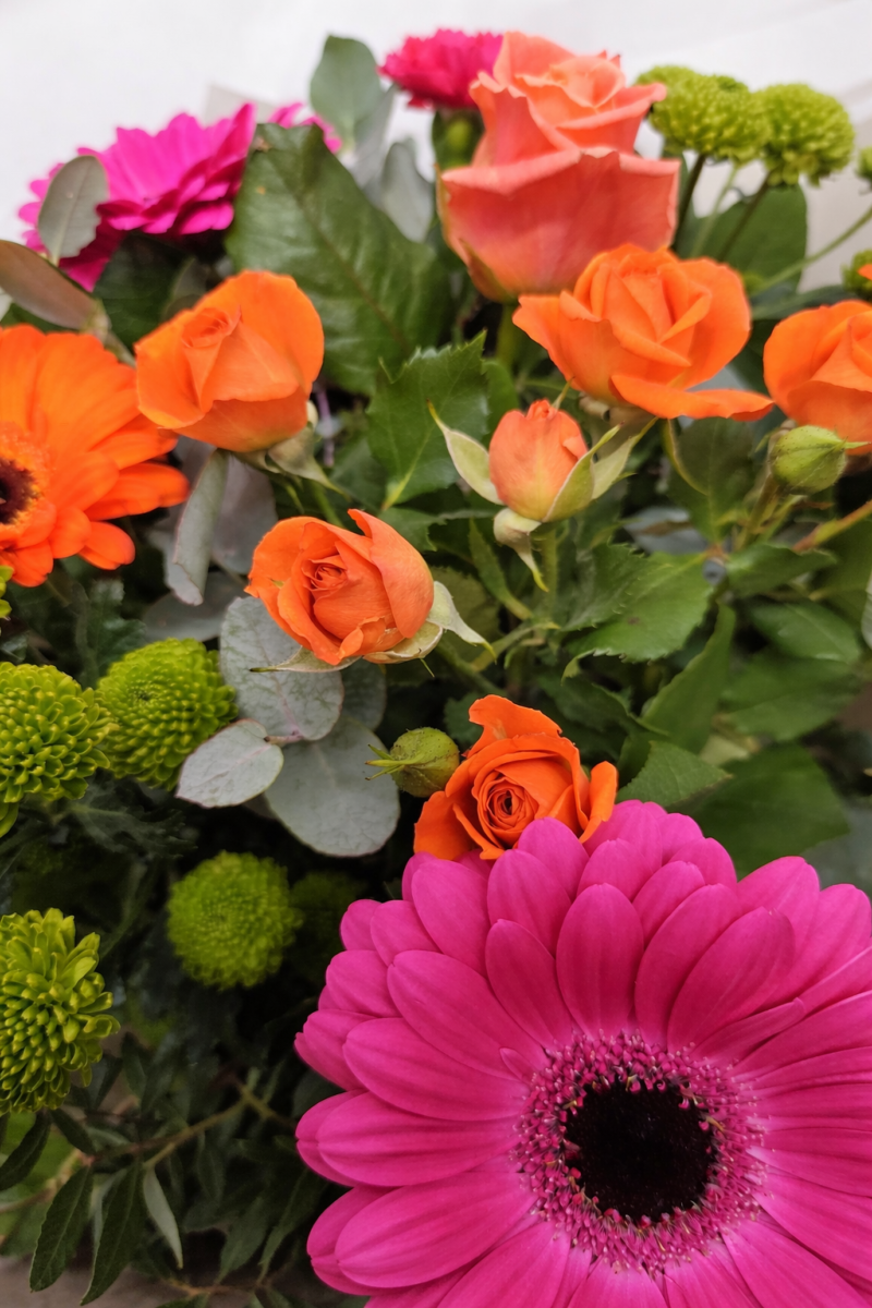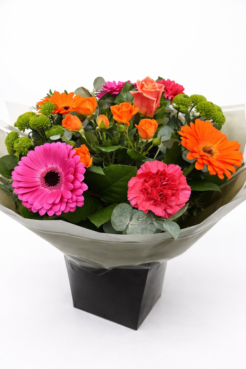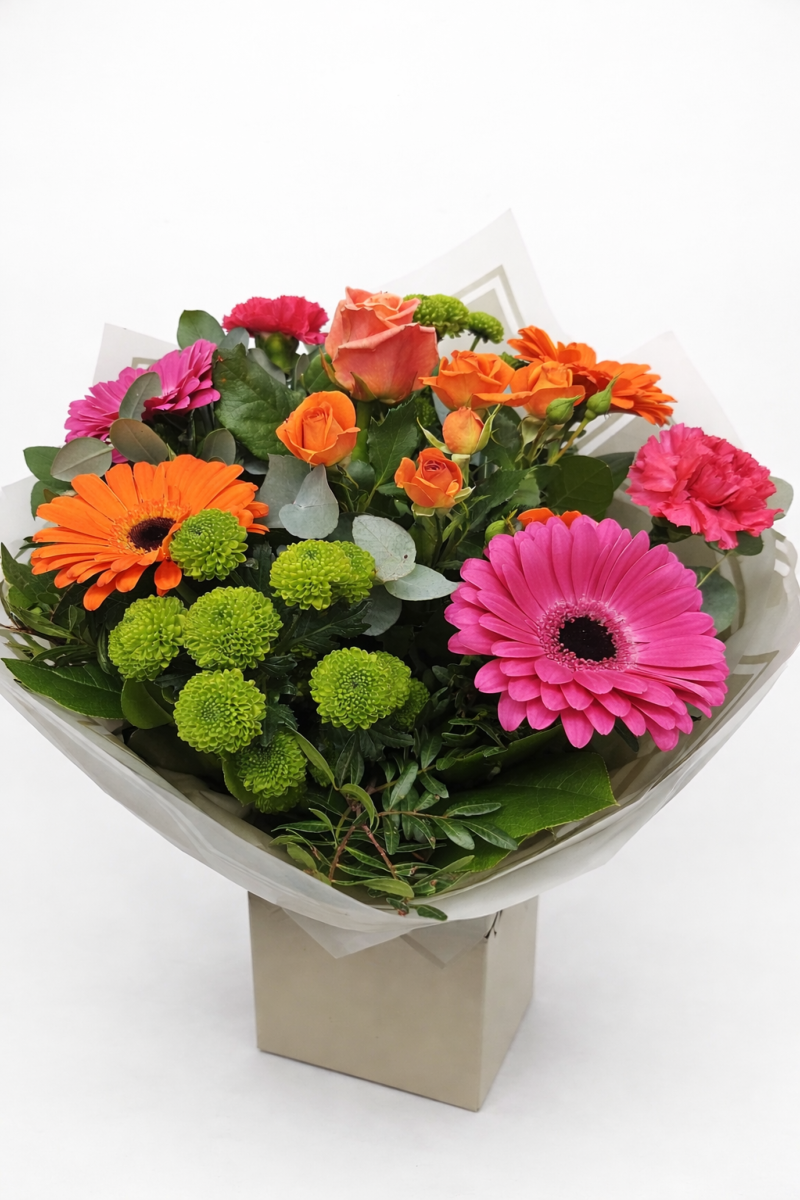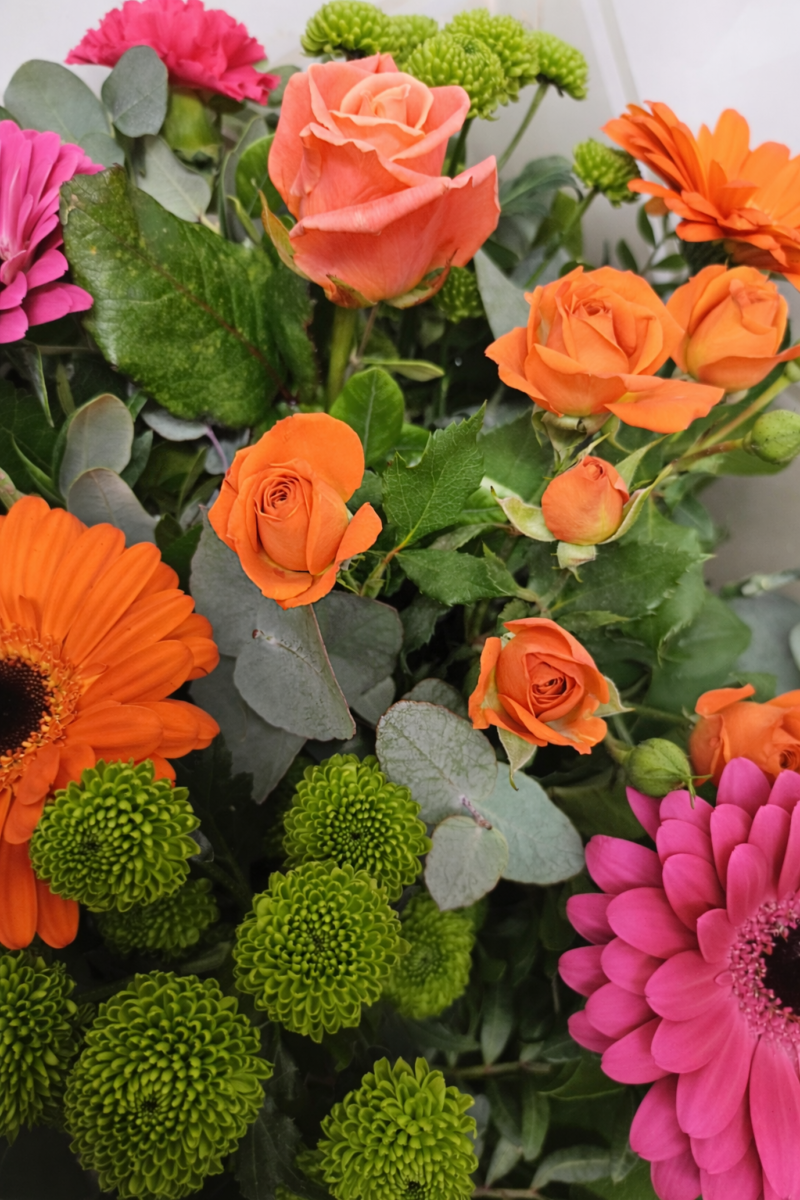 Celebrate love in all its colour with Bright As My Love. This vibrant Valentine’s bouquet is bursting with bright gerberas, cheerful green chrysanthemums, rich pink carnations, and stunning orange roses, all beautifully arranged with fresh foliage.