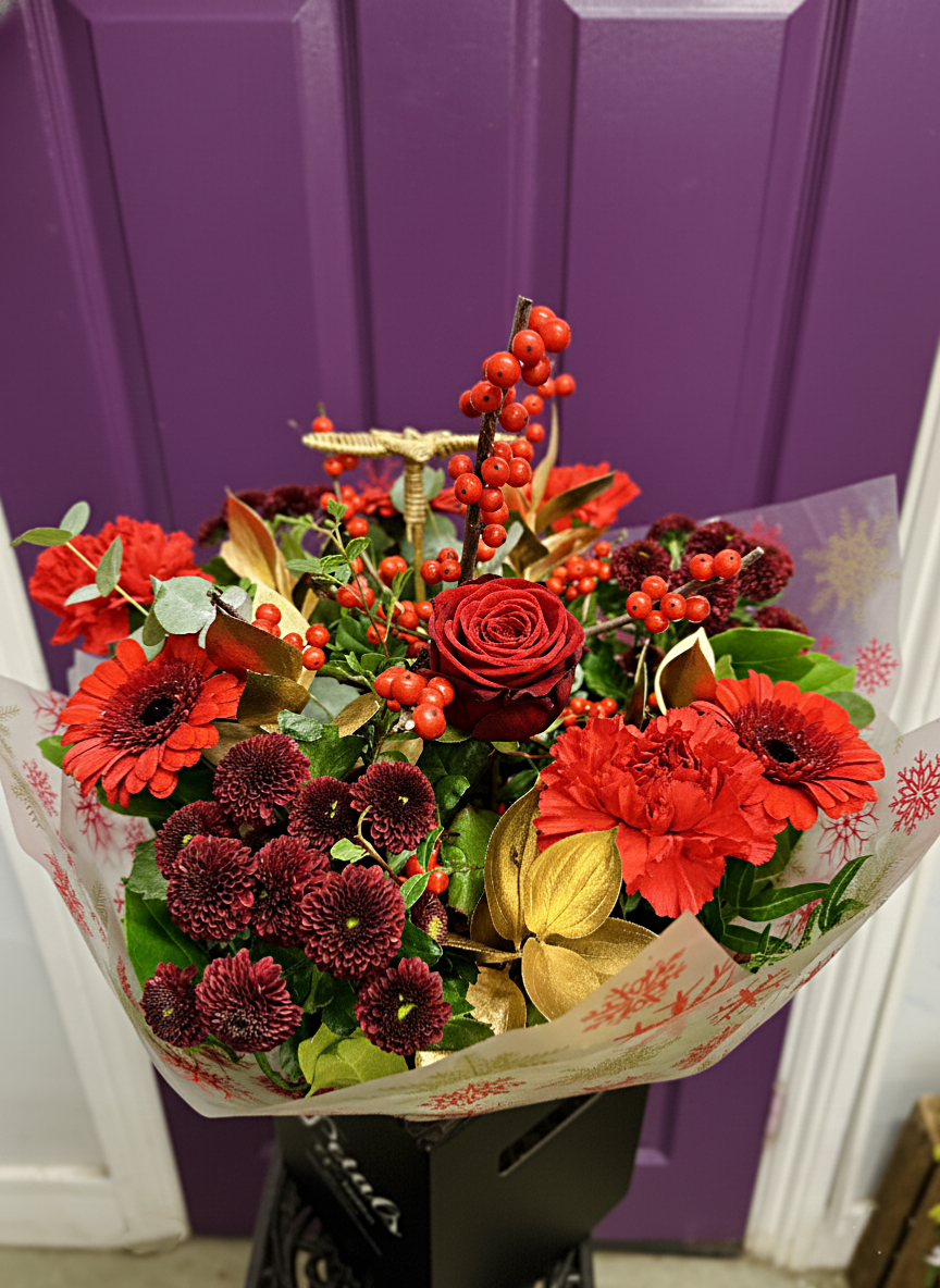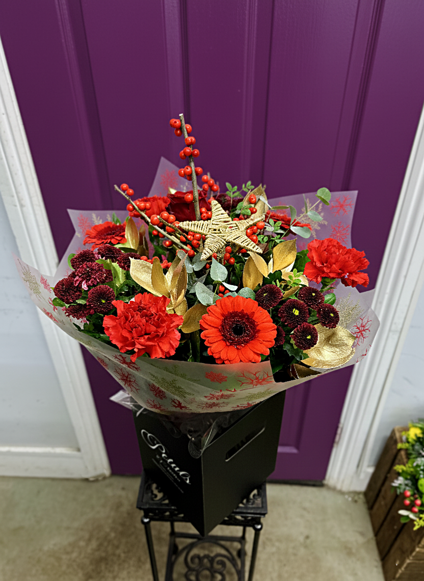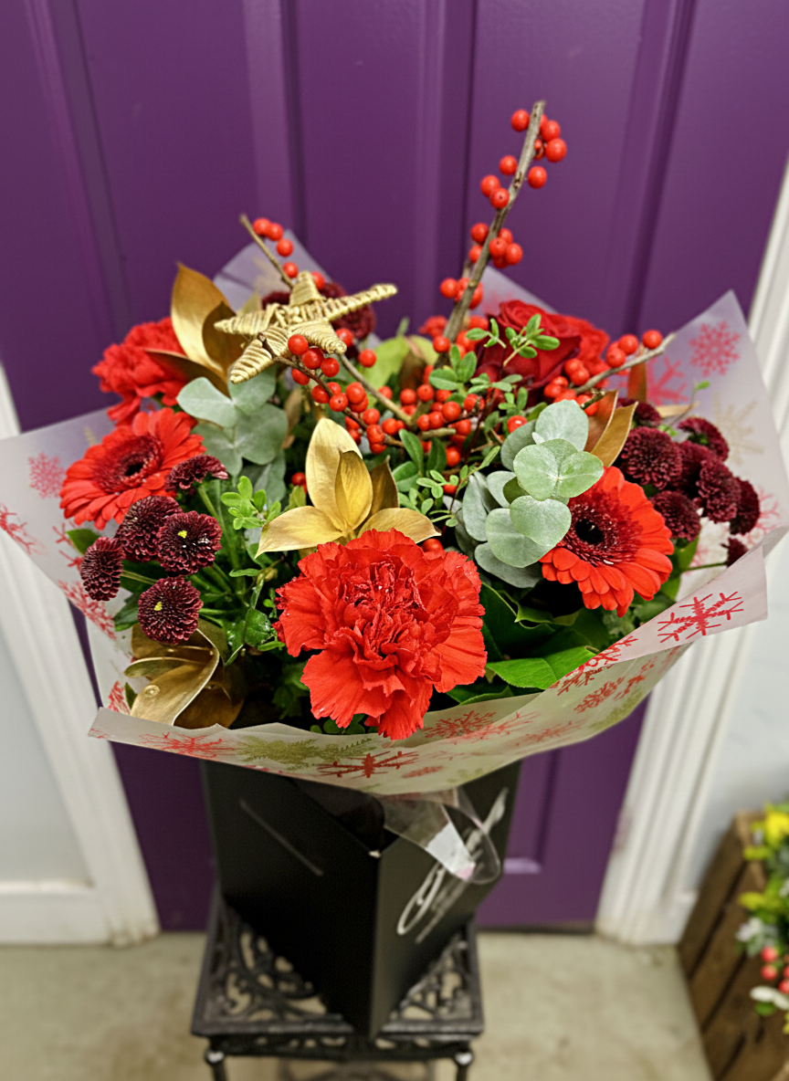 A luxurious festive hand-tie featuring rich crimson and deep burgundy blooms, accented with vibrant berries and lush greenery. Highlighted by shimmering gold foliage and a stylish star detail, this sophisticated bouquet captures the magic of Christmas with timeless elegance. |