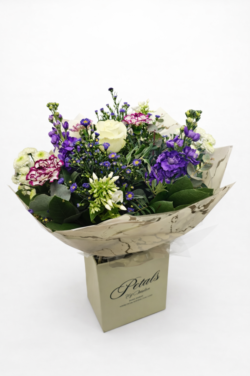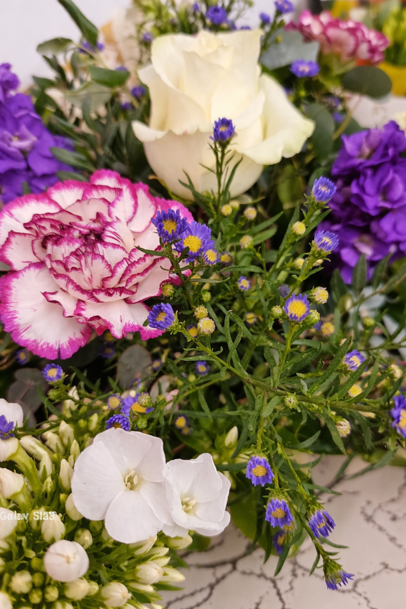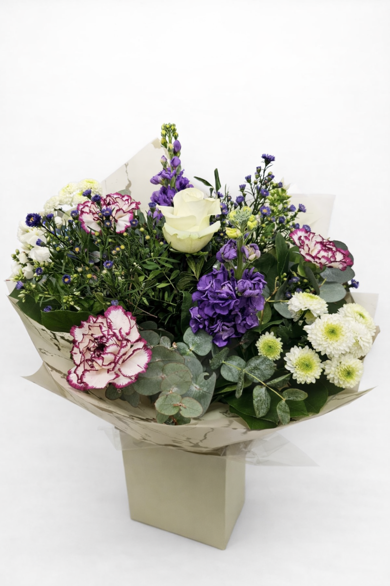 Soft, elegant, and full of heartfelt charm, Violet Whisper of Love is a beautifully balanced Valentine’s bouquet designed to speak gently but deeply. Featuring a classic white rose at its heart, surrounded by rich purple blooms, delicate white flowers, and lush green foliage, this arrangement blends romance with calm sophistication.